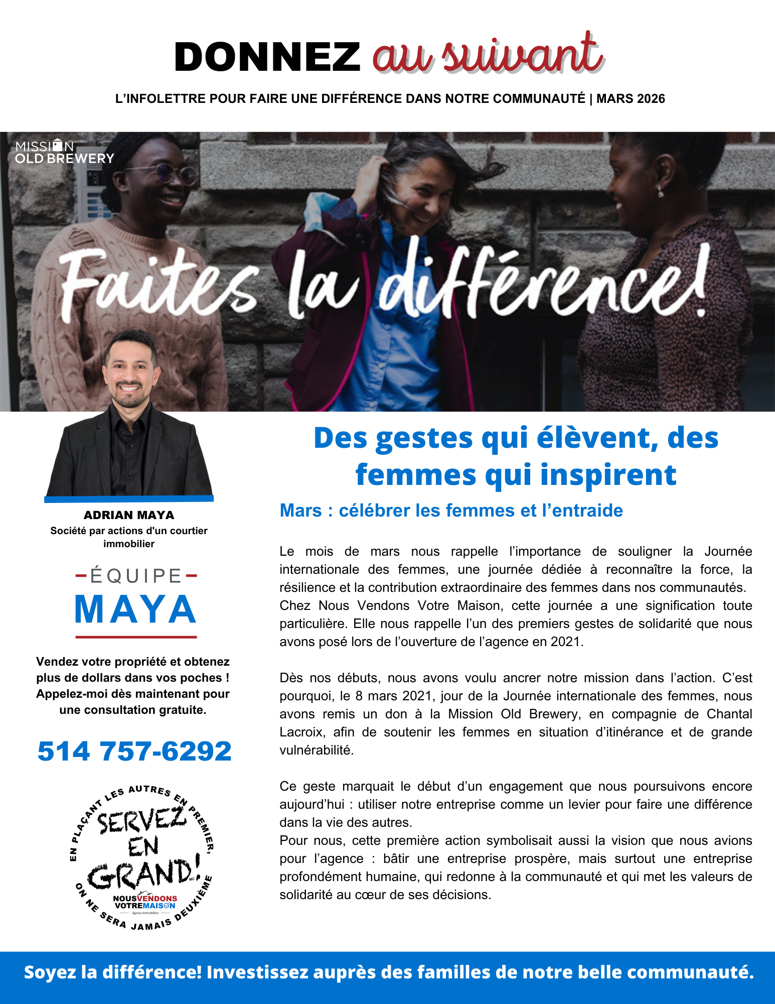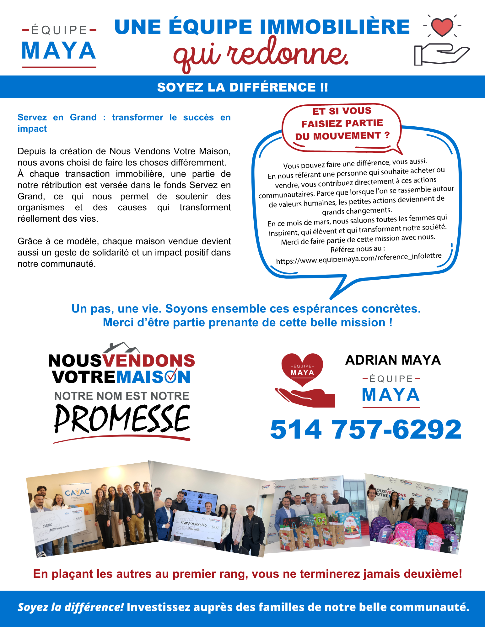 Pour chaque propriété vendue, les courtiers de l’équipe Maya et de l’agence Nous Vendons Votre Maison remettent une partie de leurs revenus à des causes importantes. Et ce n’est pas tout : nos chefs d’équipe s’engagent à doubler ces contributions!